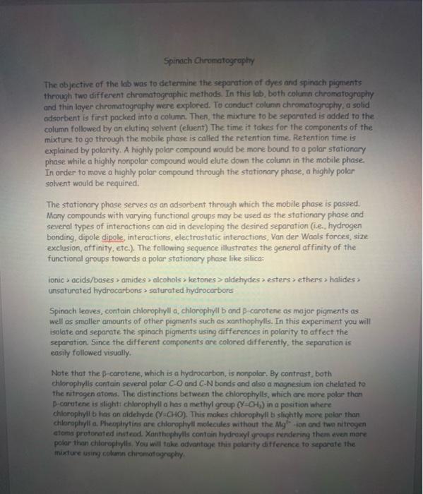 Solved Spinach Chromatography The objective of the lab was